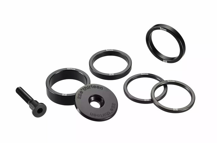 Level Up Your Ride With E*Thirteen's Top Cap & Headset Spacer Kit! , Reduce Weight and Add High-End Style While Fine-Tuning Your Cockpit. , Experience Increased Strength and Performance With Anodized Alloy Top Cap and 7075 Al Bolt. , The Lightweight, Low-Profile Alloy Top Cap Integrates Perfectly with e*Thirteen stems, but is equally at home on most stems on the market. , Bolts are brilliantly anodized in colors to match e*thirteen plus stems and other components. , T25 Hardware Means Single Tool Adjustments of Any Part of Your E*Thirteen Bar/Stem Assembly., 5 Black Anodized Alloy Headset Spacers in Multiple Sizes Allow the Ultimate Flexibility in Rise Adjustment. , Size: 34.8mm Diameter., Weight: 33G/Kit., Scope of Delivery: Top Cap, Steerer Bolt, 1x10mm, 2x5mm & 2x3mm Black Anodized Alloy Headset Spacers.