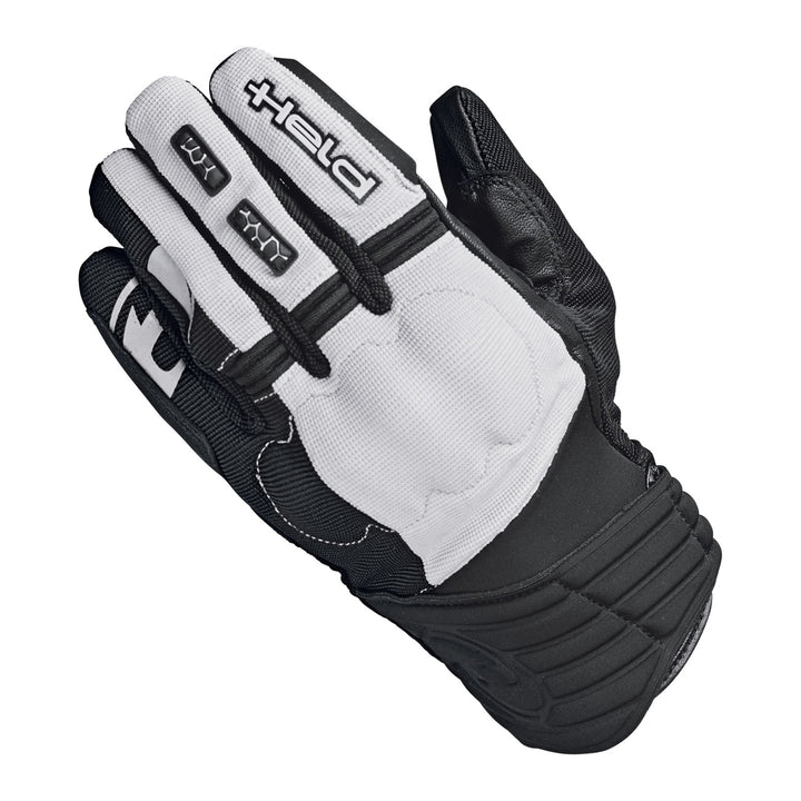 Held Mc-Handskar Hamada WP Grå med slitstark design, vit och svart ovansida med förstärkningar och skydd för motorcykelförare.