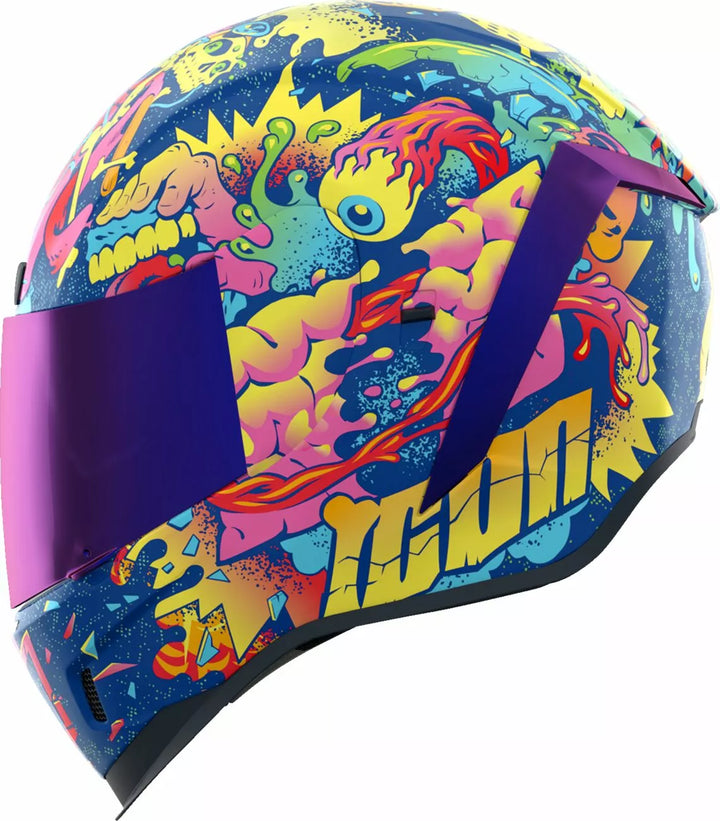 Injection Molded Polycarbonate Shell for Strength, Internal Airflow Geometry, Continuous Venting System, Sculpeed NECK Roll, FAG-FREE ICON OPTICS ™ Shield with Rapid-Reale ™ System, Prolock ™ Positive Shield Locking System, Internal Drop High Visor must only be used while the main face shield is in the fully closed position, removable Molded Breath Deflector, Removable Hydradry ™ 3-Piece Moisture Wicking Liner, Internal Speaker Pockets Work With Icon's R.A.U. Bluetooth Device, Includes Dark Smoke Dropshield, Includes Clear & RST Purple Optics Shield ™