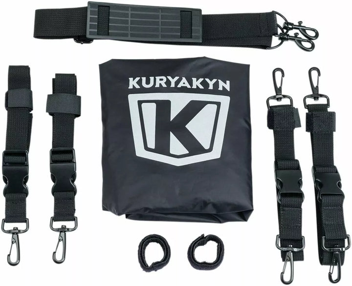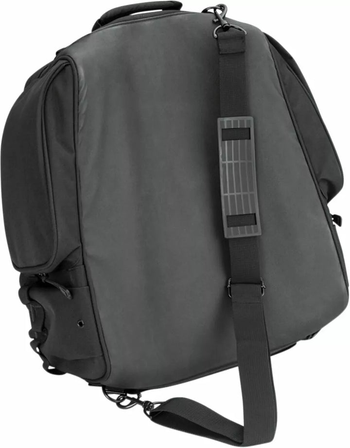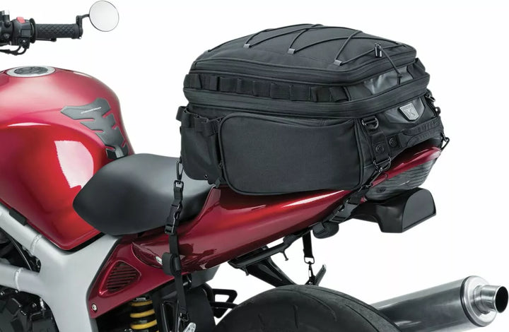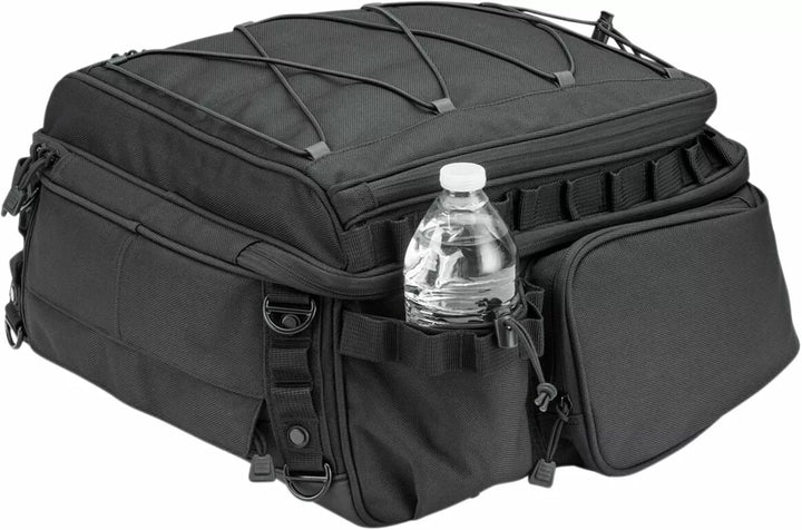 Durable UV-rated, Weather Resistant 1200 Denier Textile Material With Removable Rain Cover, External Adjustable Bungee Storage For Coat, Bedroll or Other Items, Low-Profile Carrying Handle & Removable Shoulder Strap for Off-The-Bike Conveniences Secure Mounting, Integrated Molle Modular Attachment Points, External Quick-Stash Pockets & Bottle Pockets, Includes Optional Clear Protective Film for Fender/Paint Protection, Dimensions: 17.5 "Wide X 15" Deep X 8 "Tall, Cubic Inch: 1