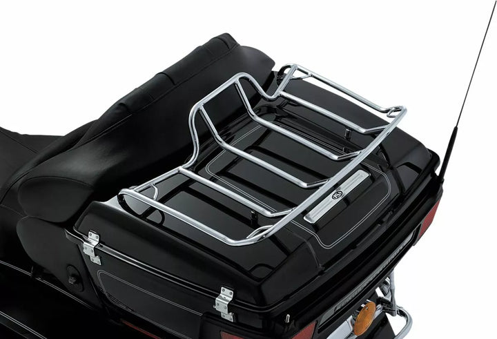 Extra-Large Luggage Rack Has A Deep-Crate Design To Keep Items Secure, Kit Allows Luggage Rack to Be Positioned 1/2 "Forward or Back From Its Current Position, Deep Crame Handles Sleeping Bags, Tents, Jackets or Rack Bags With ease snap, constructed of tubular steel