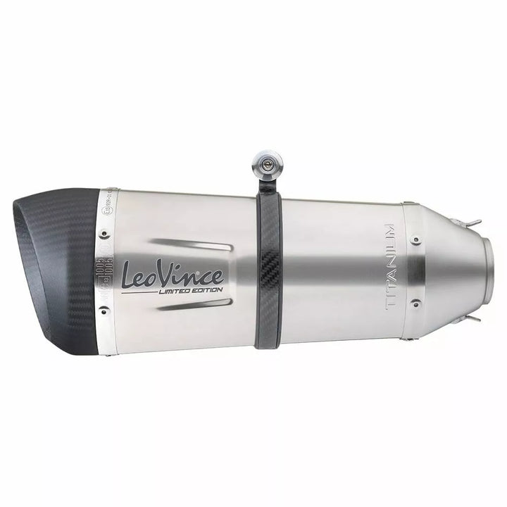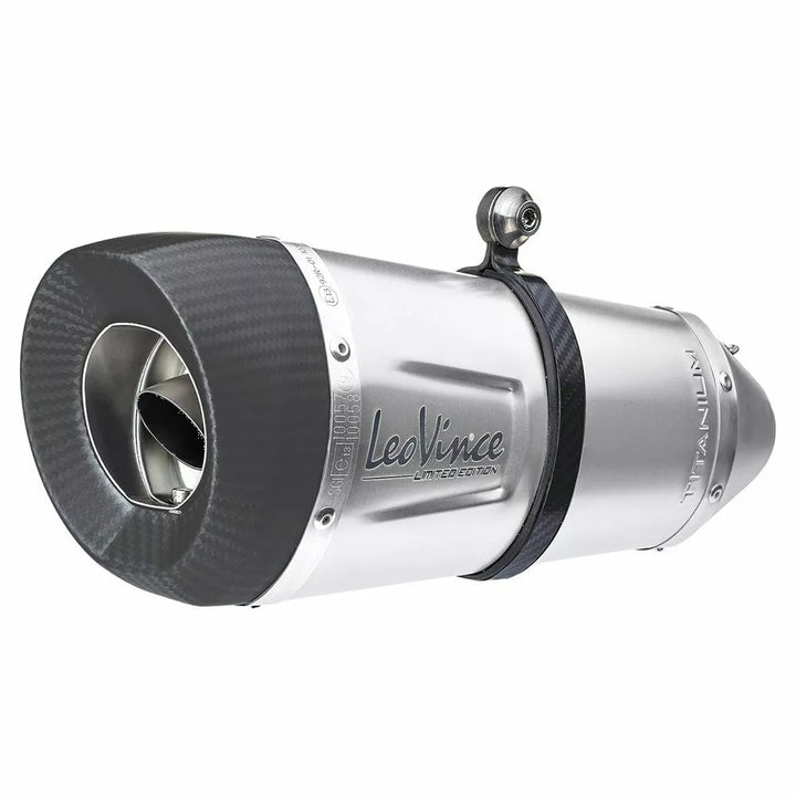 Factory's Titanium Slip-on Muffler, The Lightness of Titanium and Carbon Fiber: Leovince Has Combined These Two Elements Together and Has Created a Series of "Limited Edition" Exhausts., The Exhaust Outer Sleeve of the "Titanium Limited" Is Entit "Is Entire The End Cap is in carbon fiber, Embellished with a math clear coating for an even more refined look and to even maximum uv resistance., The fastening strap is also in full carbon., features, titanium grade 1 outer sleeve, full carbon end cap with math math math math math maths "Leovince" and "Limited Edition" Logos, Debossed "Titanium" Logo