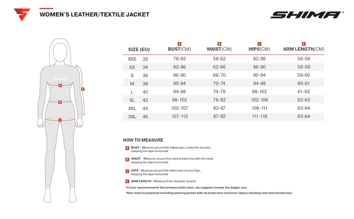 Storleksguide för Shima Dam Textil Mc-Jacka Drift Grå, med mått för byst, midja, höfter och ärmlängd för olika storlekar från XXS till 3XL.