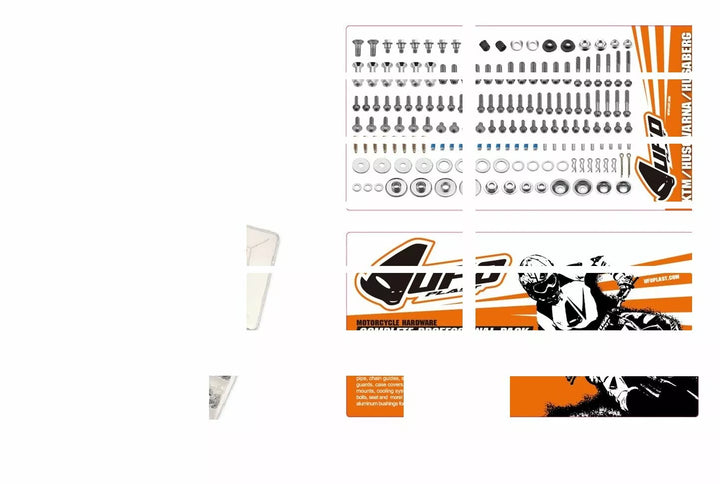 Factory Style Hardware Kits Fastens: All Plastic, Sub-Frame, Brake System, Exhaust Pipe, Chain Guides, Sprock, Skid Plate & Guards, Case Covers, Triple Clamps, Bar Mounts, Cooling System, Axel Pinch Bolts, Seat and More