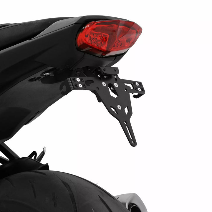 The License Plate Holder is Extremely Durable and Weather Proof., Black Powder Coated. , The License Plate Holder Can Be Used For Any Kind of License Plate (175mm Width)., No Modification of Fairing Required., Stepless Adjustment of Rake Angle., Indicator Support Adjustable in 3 Positions. Plate., Special Indicator Light Mounts (Sold Separately) Required for Stock Indicator Lights., Kit Includes: 1 License Plate Holder Incl. Mounting Kit., LED License Plate Light "e Approved" Incl. Support., Back Light With Support.