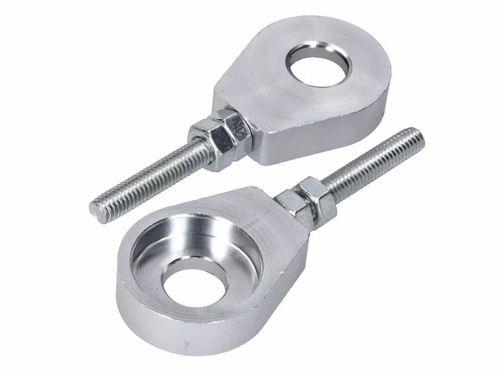 Anodierte Aluminiumkettenspannungen Set von 2 Teilen, die für Moped / Mokick -Hinterachse mit 12 mm Durchmesser geeignet sind. Das Set wird mit M6 -Sperrmuttern geliefert.