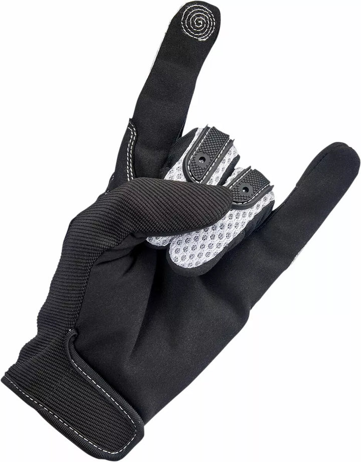 Synthetic Suede Palm Features Two-Way Stretch for a Snug, Comfortable Fit, Three-Ply, One-Piece Vented Polyester Back and Thumb Construction for Maximum Airflow, Flexible Thermoplastic Rubber Knuckle Guards and Shield Logo, Lycra® Expans and double-free polyester stitching, Thermoplastic Rubber Knuckle Guards on the Back of the Glove Provide Protection from Rocky Roost and Airborne Road Debris, A Double-Stitched Das Verstärkungsfeld am Daumen und des Indexfingers fügt Stremtth -Stiche in Fingern und Daumen hinzu, die Sie intelligenten Bildschirmen betreiben