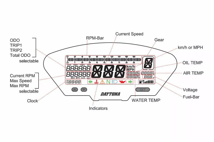 Wasserdicht (IP67), Edelstahlhalterung inklusive, schwarzes ABS-Gehäuse, Speedomets, MPH (0-250 MPH) und km/h (0-399 km/h) Selektierbar, Kilometerzähler, Uhr, Warnung mit niedriger Batterie, E-markted E-markted