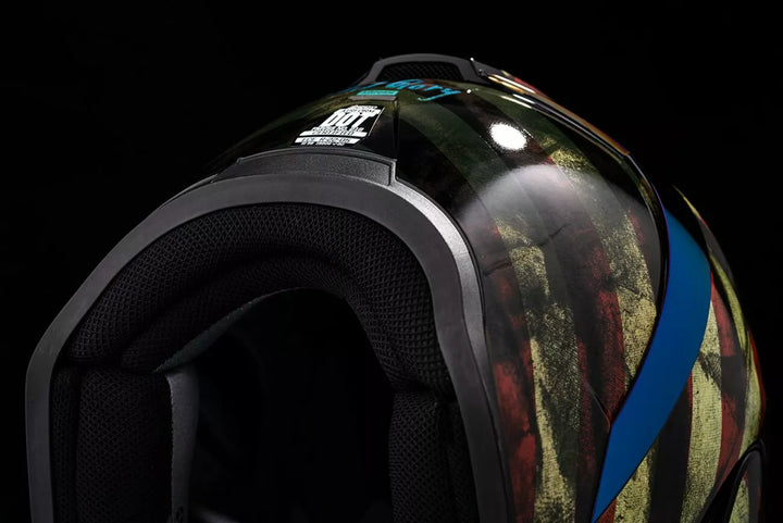 Injection Molded Polycarbonate Shell for Strength, Internal Airflow Geometry, Continuous Venting System, Sculpeed NECK Roll, FAG-FREE ICON OPTICS ™ Shield with Rapid-Reale ™ System, Prock ™ Positive Shield ™ Writing System, Internal Drop High Visor must only be used while the main face shield is in the fully closed position, removable Molded Breath Deflector, Removable Hydradry ™ 3-Piece Moisture Wicking Liner, interne Lautsprecher -Taschen arbeiten mit Icons R.A.U. Das Bluetooth -Gerät, das im Dunkeln leuchtet, umfasst Clear und RST Blue Optics ™ Shields, enthält Dark Smoke Dropshield ™