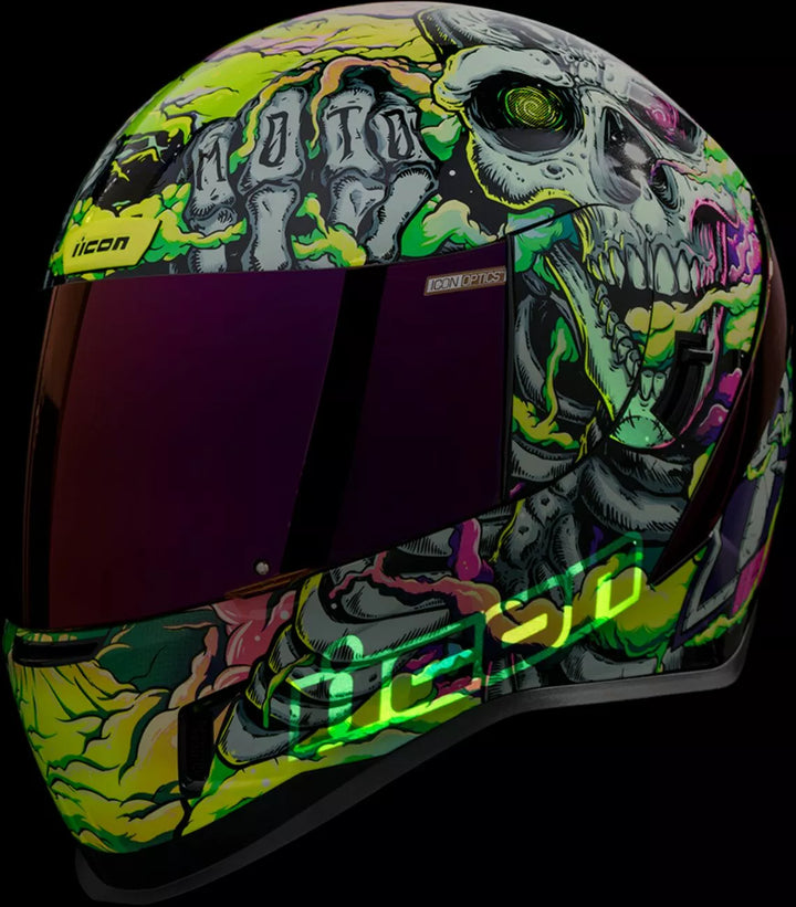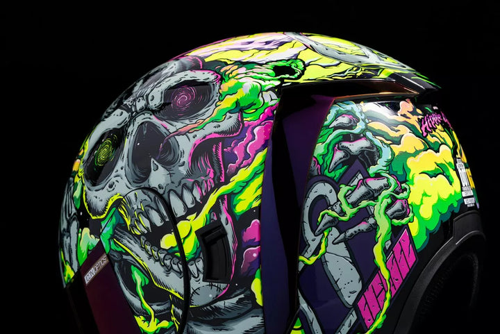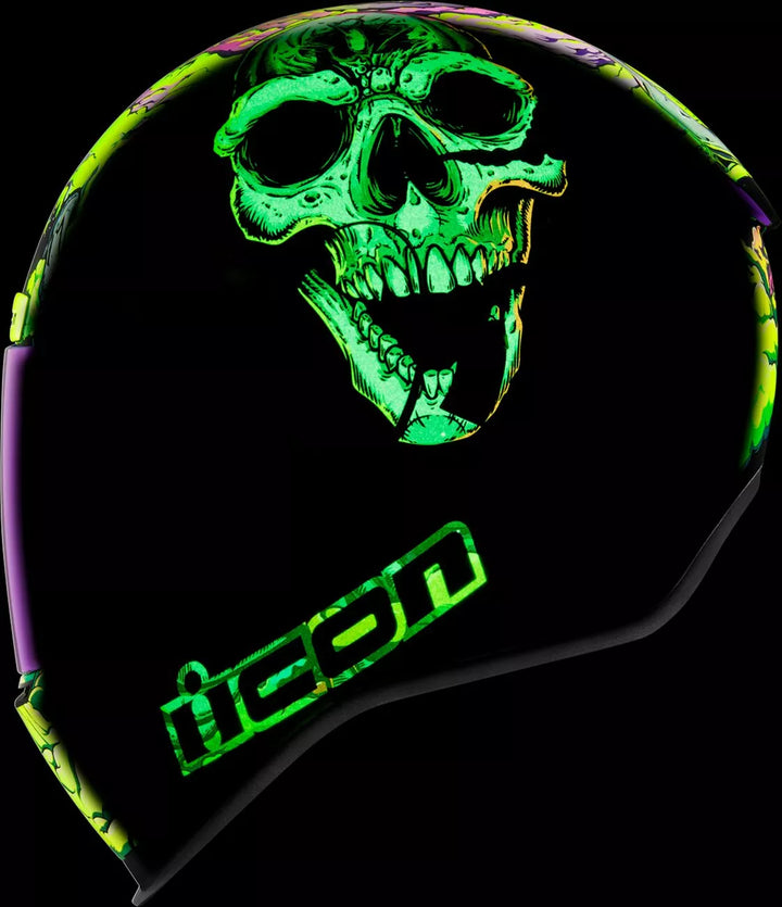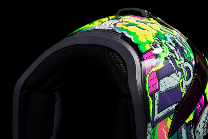 Injection-Molded Polycarbonate Shell for Strength and Durability, Intermediate Headform, Clear Fog-Free Optics ™ Shield Installed, Purple RST FAG-FREE OPTICS ™ Shield Included, Dark Smoke Locking System, PHELOK SHID ™ Removable Comfort Liner, Purple RST Spoiler Kit, Glow in the Dark Graphics, Internal Airflow Geometry, Continuous Venting System, Sculpted NECK Roll, FAG-FREE ICON Optics ™ Shield ist mit schnell geschlossener Position, abnehmbarer geformter Atemdefektor, interner Lautsprecher-Taschenarbeit mit Icons R.A.U. Bluetooth -Gerät