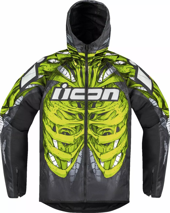 Airform Manik'r ™ Grafik auf der Vorder- und Rückseite der Jacke, 420d Polyester-Chassis mit 300D-interner Verstärkung, PU-beschichtetem Schalenmaterial mit DWR-Finish, D30® Abnehmbarer Viper-Rückenschutz; Ellbogen- und Schulter-Impact-Protectors, Bungee-Kabelstil-Kordelhaube, Airfly ™ -Menen-Vorder-Mesh-Panel mit Brust- und Rücken-Reißverschluss-Lüftungsschlitzen, Entlüftungsmanschettenschleizungen, Rückenschutz EN 1621-2 Level 1