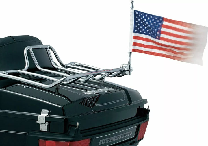 Mount Passt für die meisten Gepäckständer oder einen 1/2 "Schlauch, einschließlich vorderer Kotflügelschienen, der Flaggenwinkel vertikal (nicht einstellbar), umfasst eine amerikanische Flagge von 6" x 11 "und eine 6" x 9 "POW/MIA-Flagge