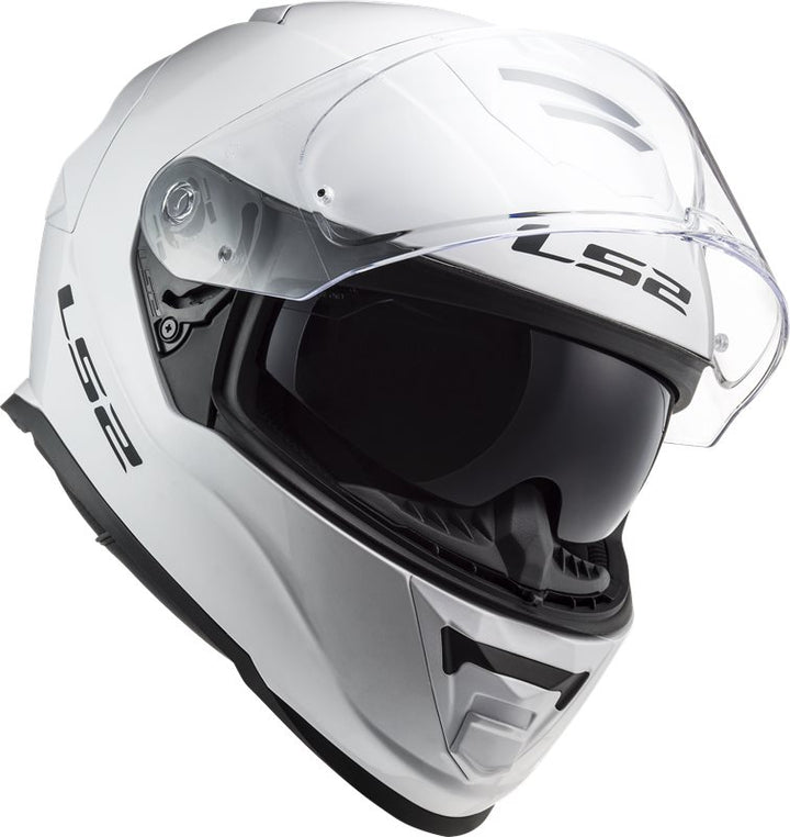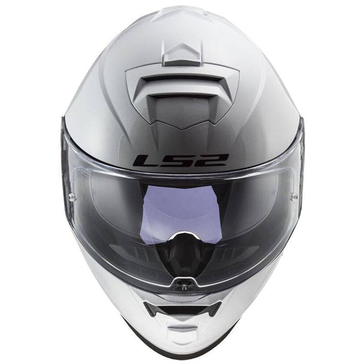 Frontal vy av LS2 Integral Mc-Hjälm Storm II Vit med tydligt visir och ventilationsöppningar för optimal säkerhet och komfort.