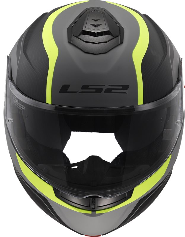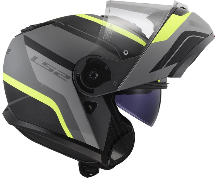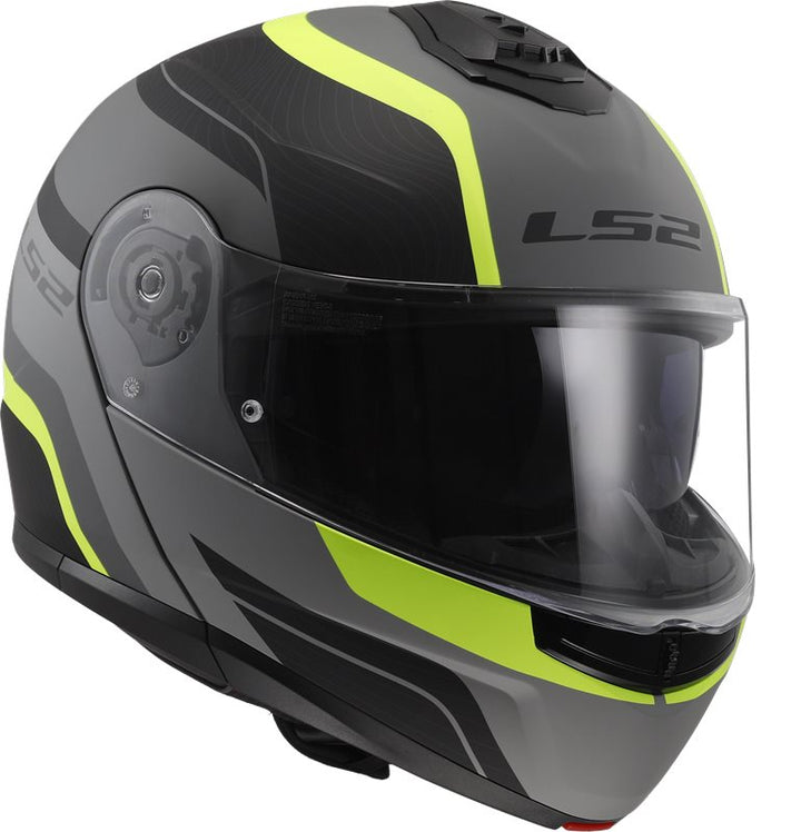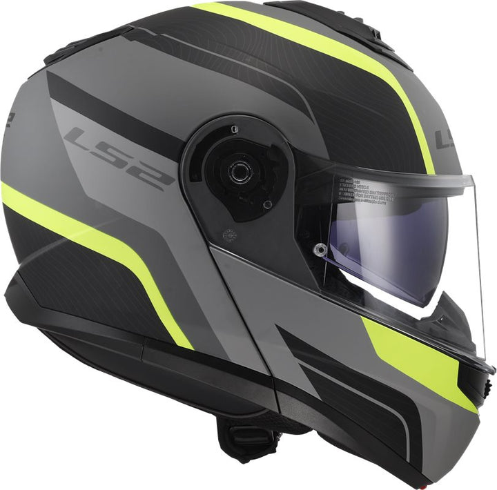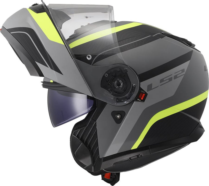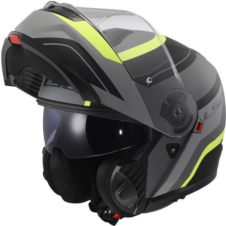 LS2 öppningsbar mc-hjälm Strobe II Monza i svart och fluorgul design med visir och aerodynamisk form för motorcyklister.