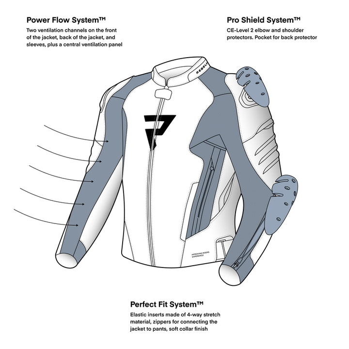 Die Motorradjacke Rebelhorn Veloce bietet dank ihres gut durchdachten Schnitts, des Komforts für den täglichen Gebrauch und für die Touren für diejenigen, die die Sicherheit von Lederkleidung bevorzugen. In Kombination mit der Veloce-Hose erzeugt es ein zweiteiliges Kostüm. Die Verwendung von 4-Wege-Stretch-Einsätzen sorgt für eine optimale Anpassung. Die Jacke hat auch ein fortschrittliches Lüftungssystem.