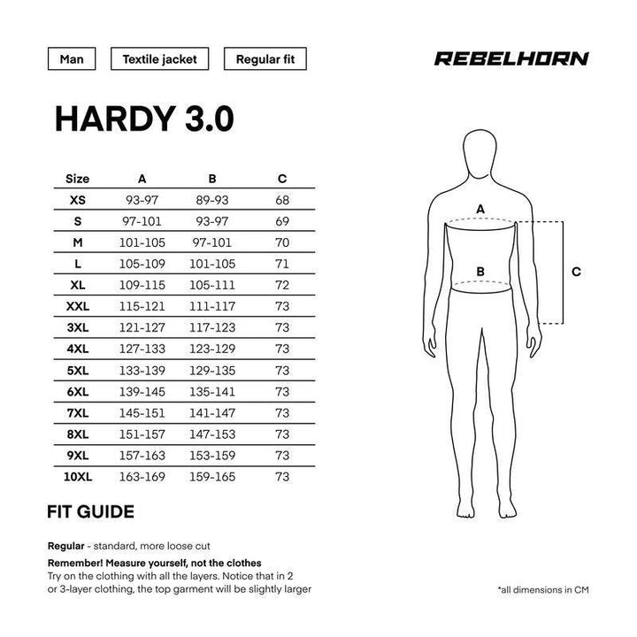 Bereit für alle Straßen, alles Wetter und alle Abenteuer - Rebelhorn Hardy 3.0 Ist die Tourenjacke, die Komfort, Schutz und Funktionalität auf ein ganz neues Niveau bringt. Es ist für diejenigen gebaut, die nicht zulassen, dass Regen, Hitze oder lange Meilen der nächsten Kurve im Wege stehen. Mit seinem fortschrittlichen 3-Store-System passt sich Hardy 3.0 reibungslos sowohl dem Klima- als auch dem Fahrstil an-ob Sie zum Nordkap fahren oder eine Sonntagsausreise im Regen unternehmen.