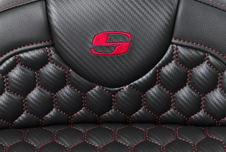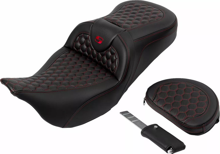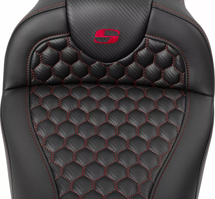 Each Seat Combines a Gel-Core ル Interior and Pro-Foam ル To Create A Foam With A Balance of Compression and Resilience Gear Long Distance Comfort, Pro-Foam ル Unique Molding Process Creates, See Elevae Resistant, Self- Durability as well as Comfort, Honeycomb (HC) Pattern Incorporates Modern Geometry In A Stylish Seat Cover, Saddlegel ル In Front and Real Reduces Tailbone Pressure and Increases Circulation and Comfort for Both Driver and Passagier, entworfen und hergestellt in den USA