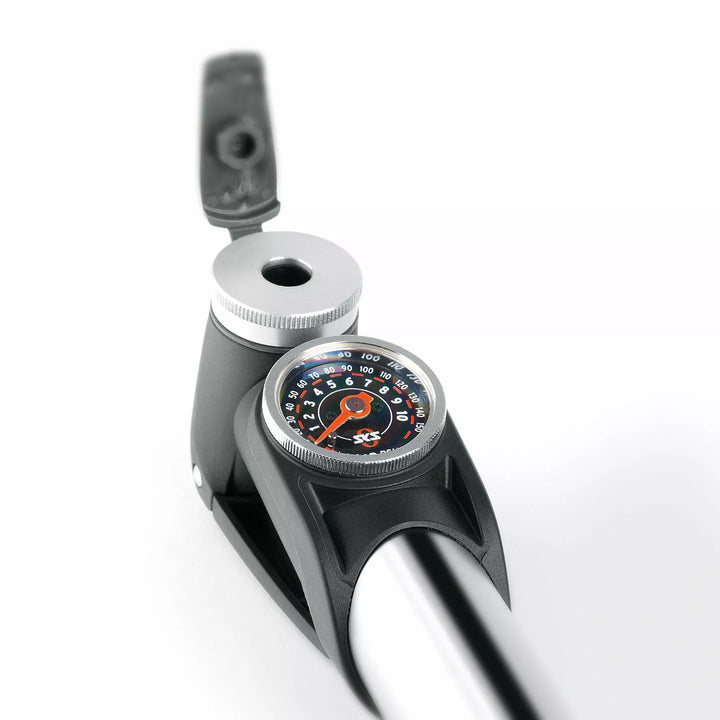 Vollständige Kontrolle Auch unterwegs: Die SKS INIDEX-Steuerung Mini-Pumpe hat am Ende des hochwertigen Aluminiumfasss eine kleine, runde Analogdruckanzeige. Der integrierte EVA-Pumpenkopf dieser Fahrradpumpe passt zu allen Arten und den Klemmen hebelt ein sicheres Ventil. Falten Sie T-Griff sicher, dass ein optimales und komfortables Pumpen bis zu 10 bar (144 psi). Die Fahrradpumpe wird auch mit einem Pumpenhalter aus Deutschland ausgestattet.