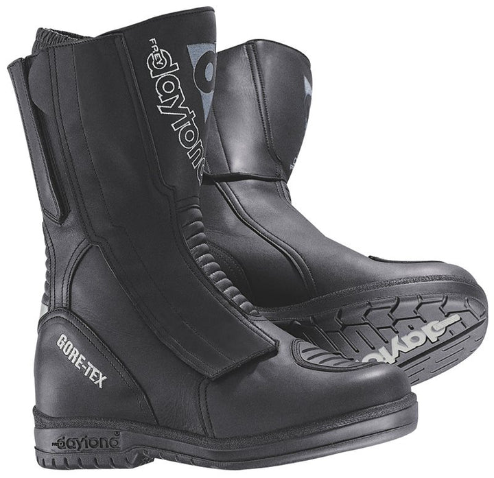 Specialstiefel mit ca. 6 cm höherem Zwischensohle aus Kork an der Ferse, was es einfacher macht, sowohl den Fußstütze als auch den Boden zu erreichen. Der Stiefel hat ein Obermaterial aus geöltem, wasserabweisendem, starkem Vollnarbenleder von Rind und ist ausgestattet mit einer wasserdichten und atmungsaktiven GORE-TEX® Membran sowie einer Innenausstattung aus Textil (80% Polyamid / 20% Polyester). Klettverschlussanpassungen am Schaft zur Anpassung der Wadenweite sowie eine Schließung über doppelte Reißverschlüsse für einen einfachen Einstieg. Lederinnenausstattung am inneren Schaft und Verstärkung aus strapazierfähigem PU-Schaum am Schalthebel. Anatomisch geformter Schutz für das Schienbein mit Polsterung aus Latex sowie Schutz für die Knöchel auf beiden Seiten, die mit speziellem Schaum mit offenen Zellen gepolstert sind. Zwischensohle aus PU-Schaum und Kunststoff, verstärkt mit galvanisiertem Stahl, was sie torsionssteif, aber dennoch gangfreundlich macht. Ausgestattet mit Reflexmaterial von 3M-Scotchlite sowie einer robusten Touring-Sohle, die auch rutschfest ist. Schafthöhe ca. 30 cm.
