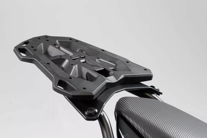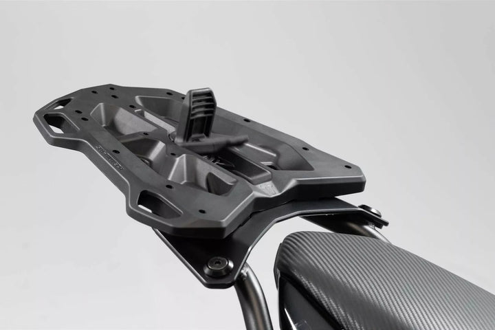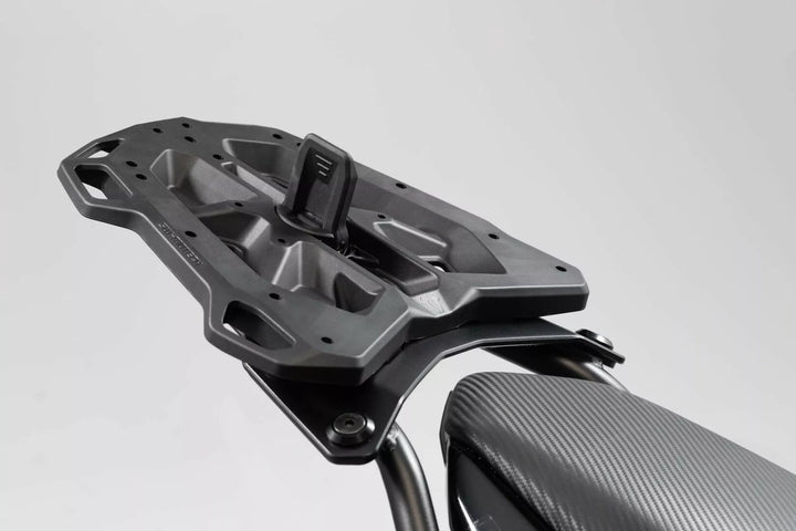 Mit einer einfachen Dreh- und Klemmbewegung kann die Adapterplatte mit jedem Straßenriss verbunden werden. Keine Werkzeuge erforderlich! Die Adapterplatte wird einfach auf den Rack geschoben und die rotierende Nockenriegel sicher gesperrt. Nach Ihrer Fahrt kann die Adapterplatte in Sekunden entfernt werden und nur das Rack bleibt am Motorrad. Augen peitschen.